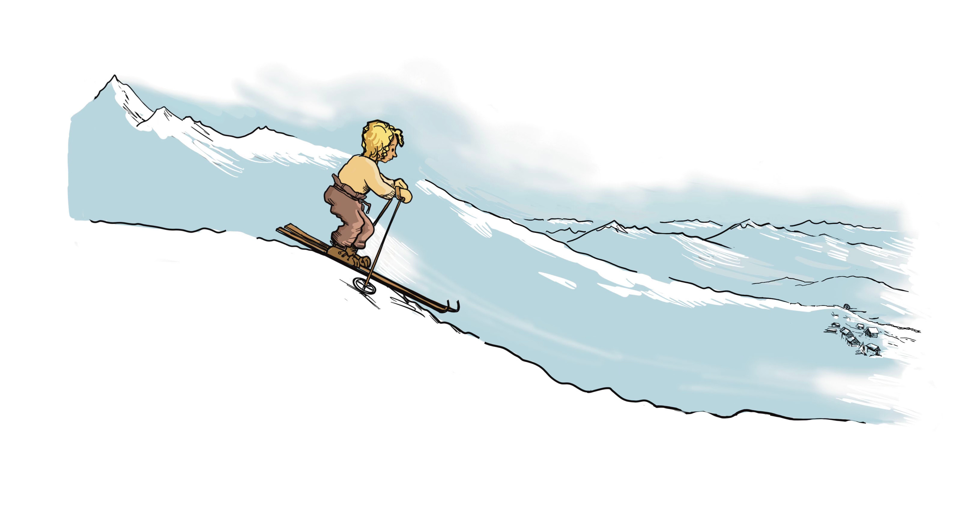 This illustration depicts how my mom told me she looked at the age of 14 in 1943. Young Franca was skiing from Bardonecchia Alta, to the town of Bardonecchia, a town in Italy close to the French border. She was told she was there to be on holiday, and to learn to ski. Little did she know that the hotel where she was staying was secretly staffed by partisans, and that her older brother, who brought her there, was also involved in the movement. You can read more about it in the book, Partisans, a Graphic History of Anti-Fascist Resistance, from BTL books.